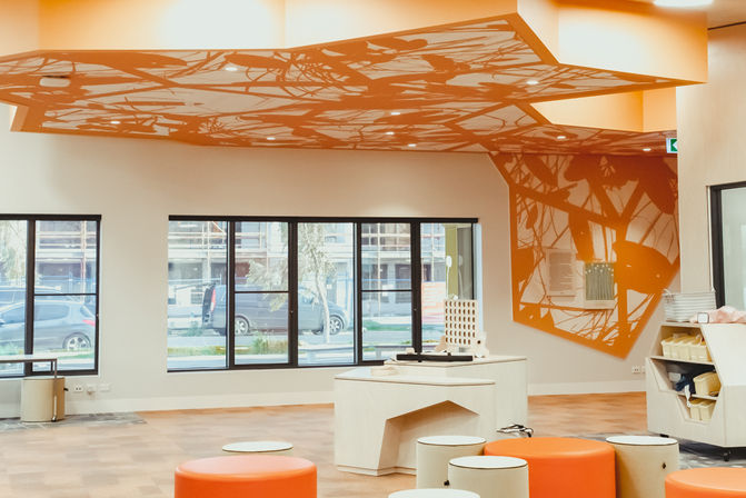 Each building follows a bold colour palette, featuring thoughtfully designed acoustic ceiling panels with angular forms. Classrooms are fitted with BACH Whiteboards, while interiors are enhanced by matching acoustic wall fabrics. A testament to the fusion of design and education. The school also incorporates innovative design features informed by Indigenous artists, including the “Billy Button” theme, which is present throughout.